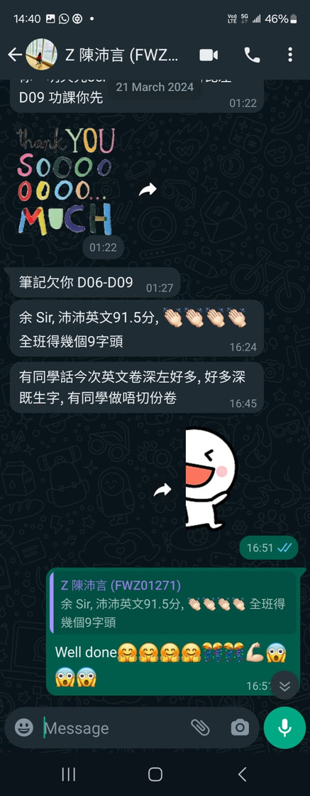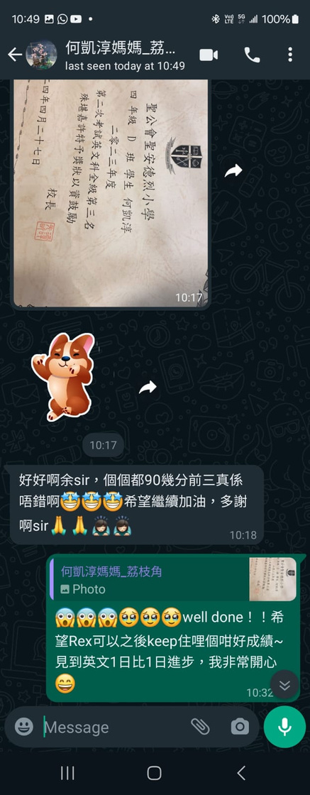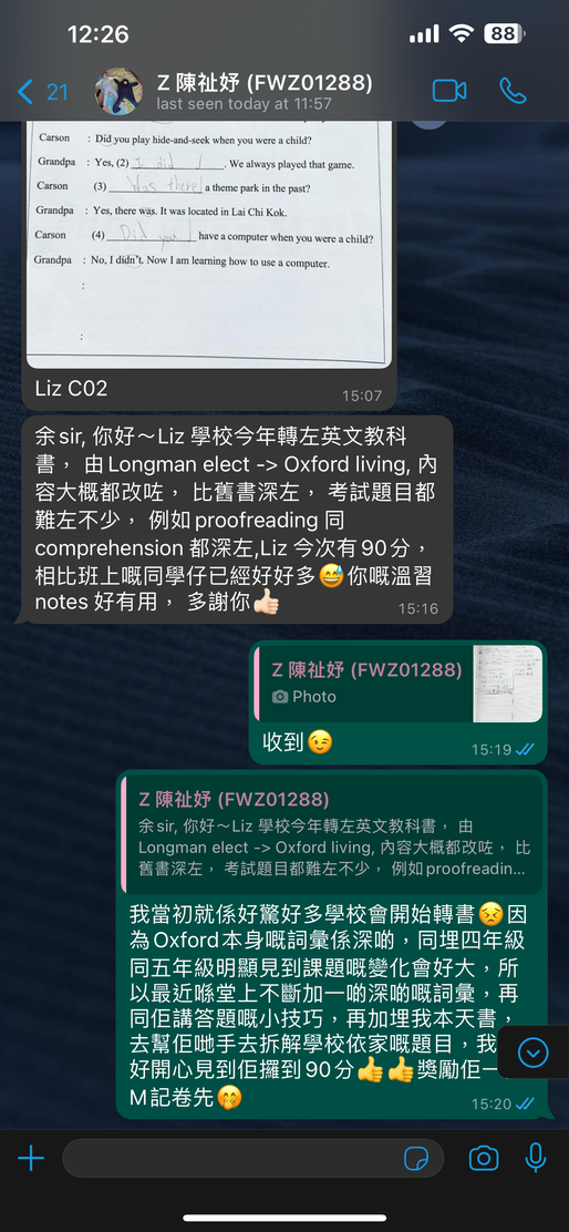 在余Sir教導下不少學生都有飛躍性進步, 曾有門生由長期不合格跳升30分,呈分試80多分。2022-23年度余sir近8成門生入讀屯門區Band 1中學,2023-2024學年更有學生入讀九龍區名校 ,可見余sir對升中面試技巧,英文能力提升和心態處理如指諸掌,